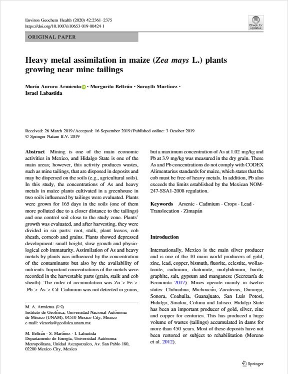 Asimilación de arsénico y metales pesados en maíz cultivado en suelos cercanos a jales